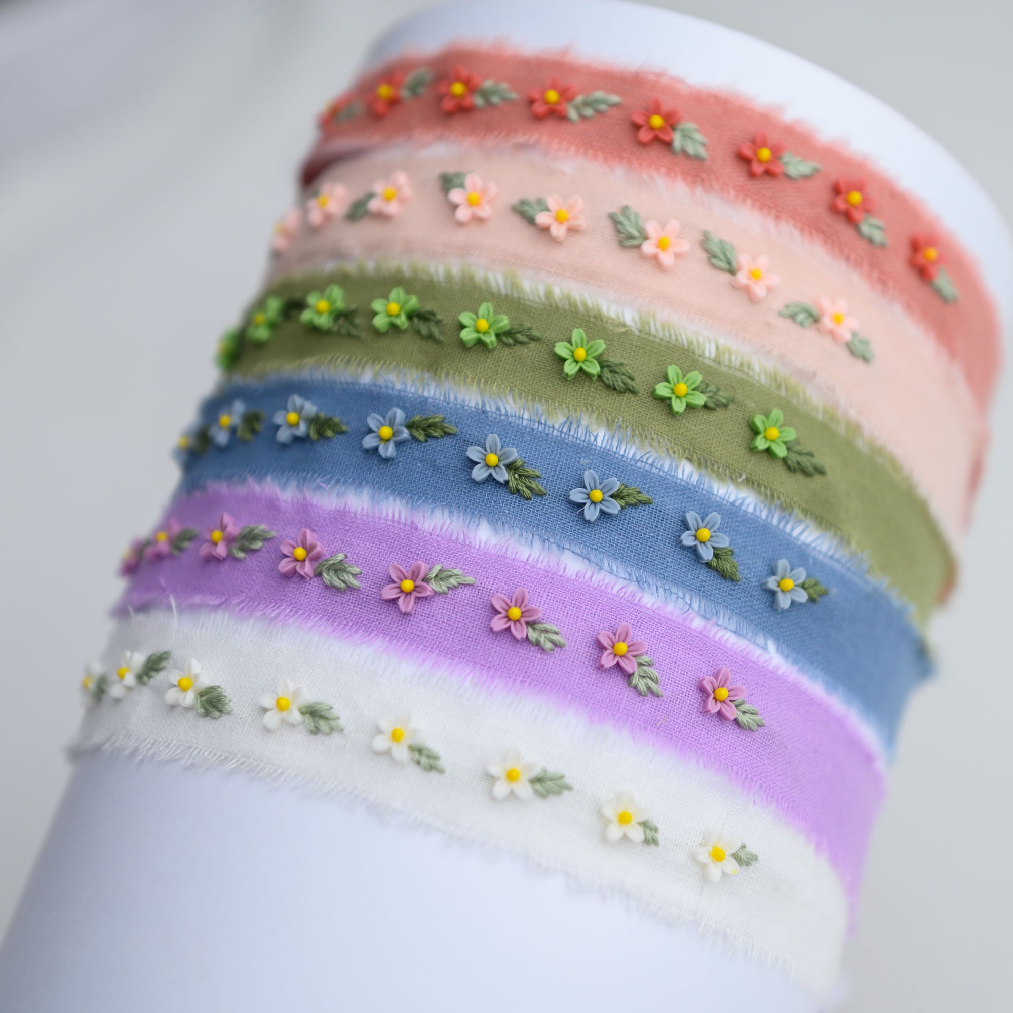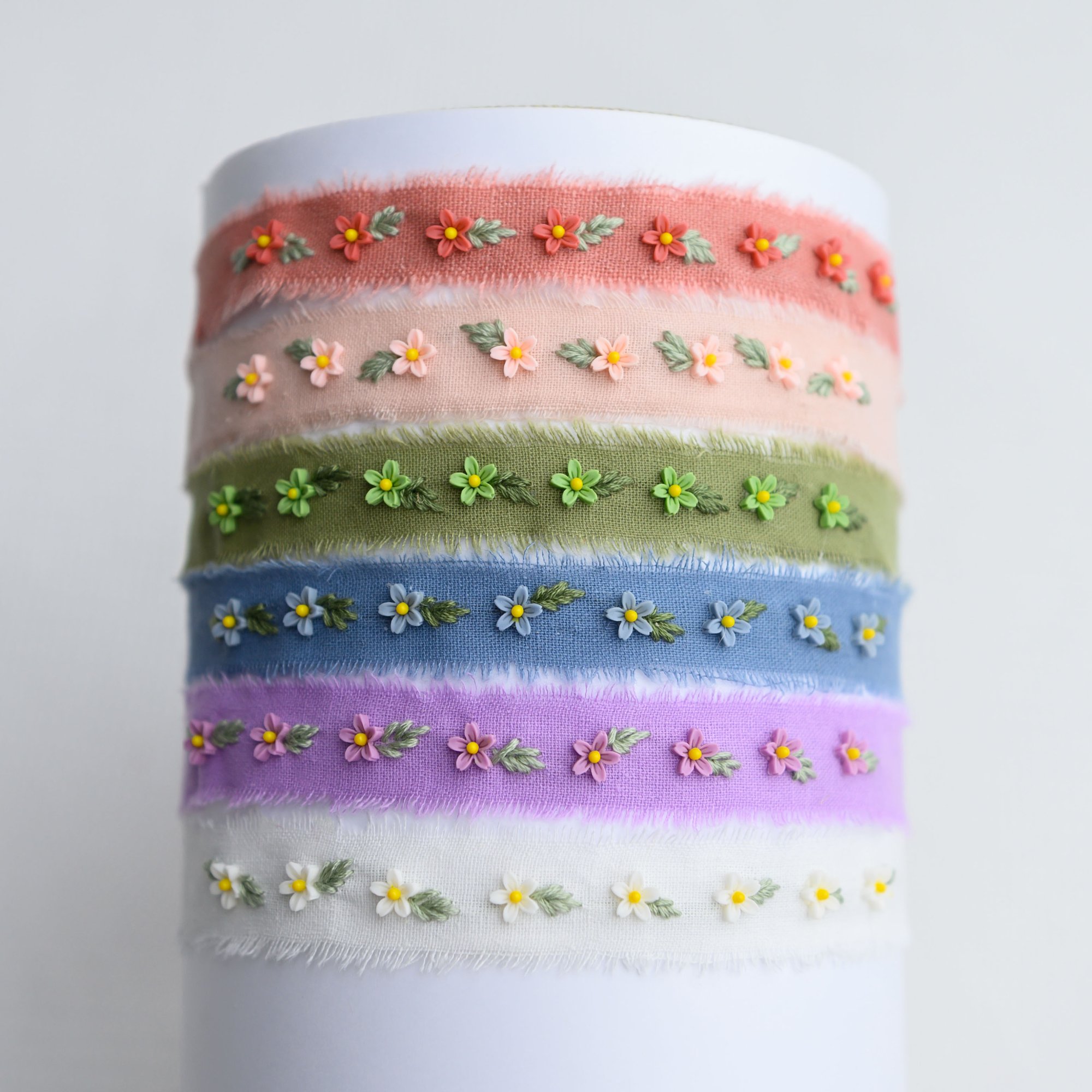 tiny detailed flowers and hand stitched leaves on an adjustable tieback headband