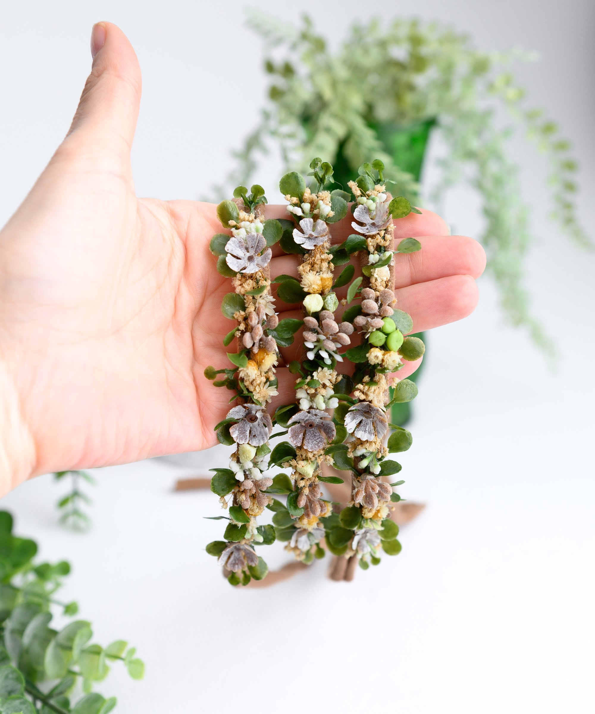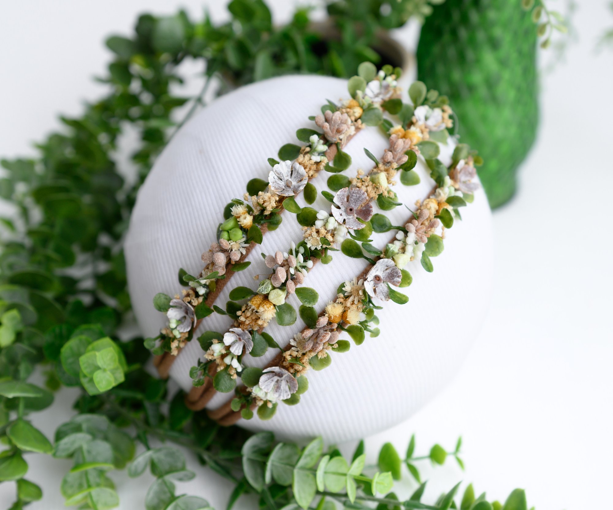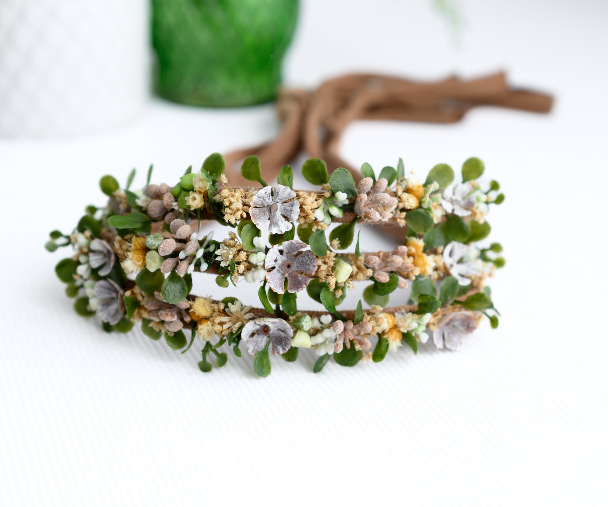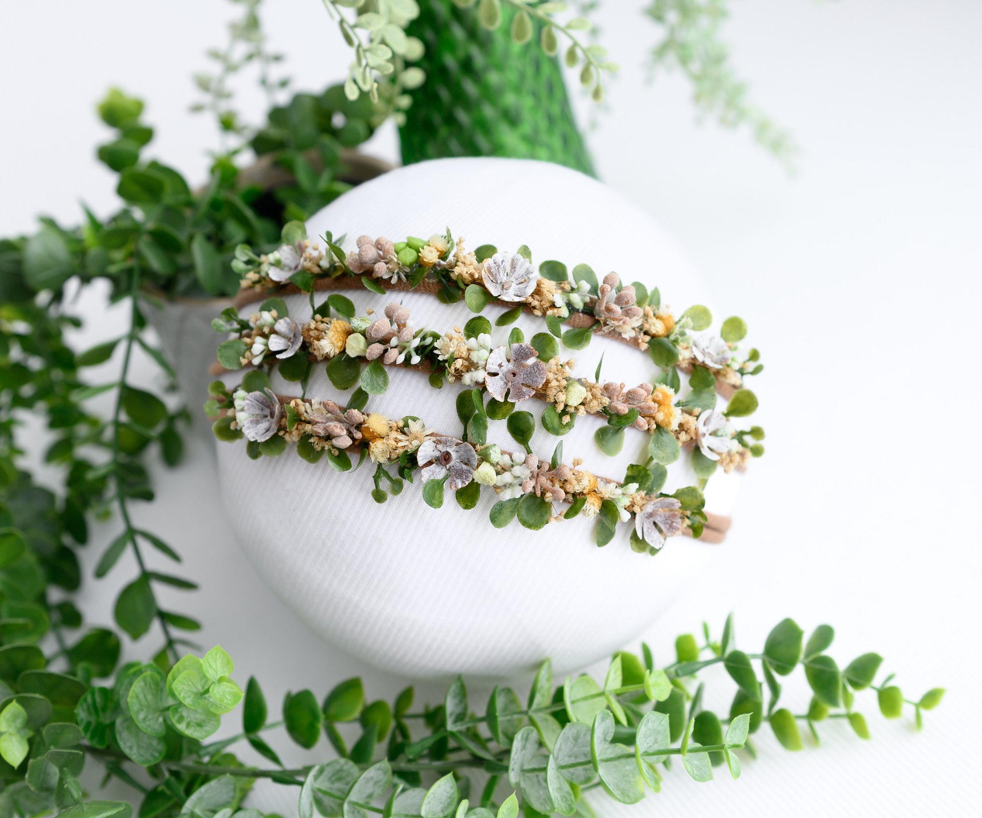 A dainty woodland-inspired headband featuring miniature acorns and earthy greenery — the perfect touch of autumn magic.