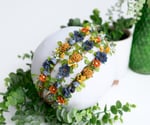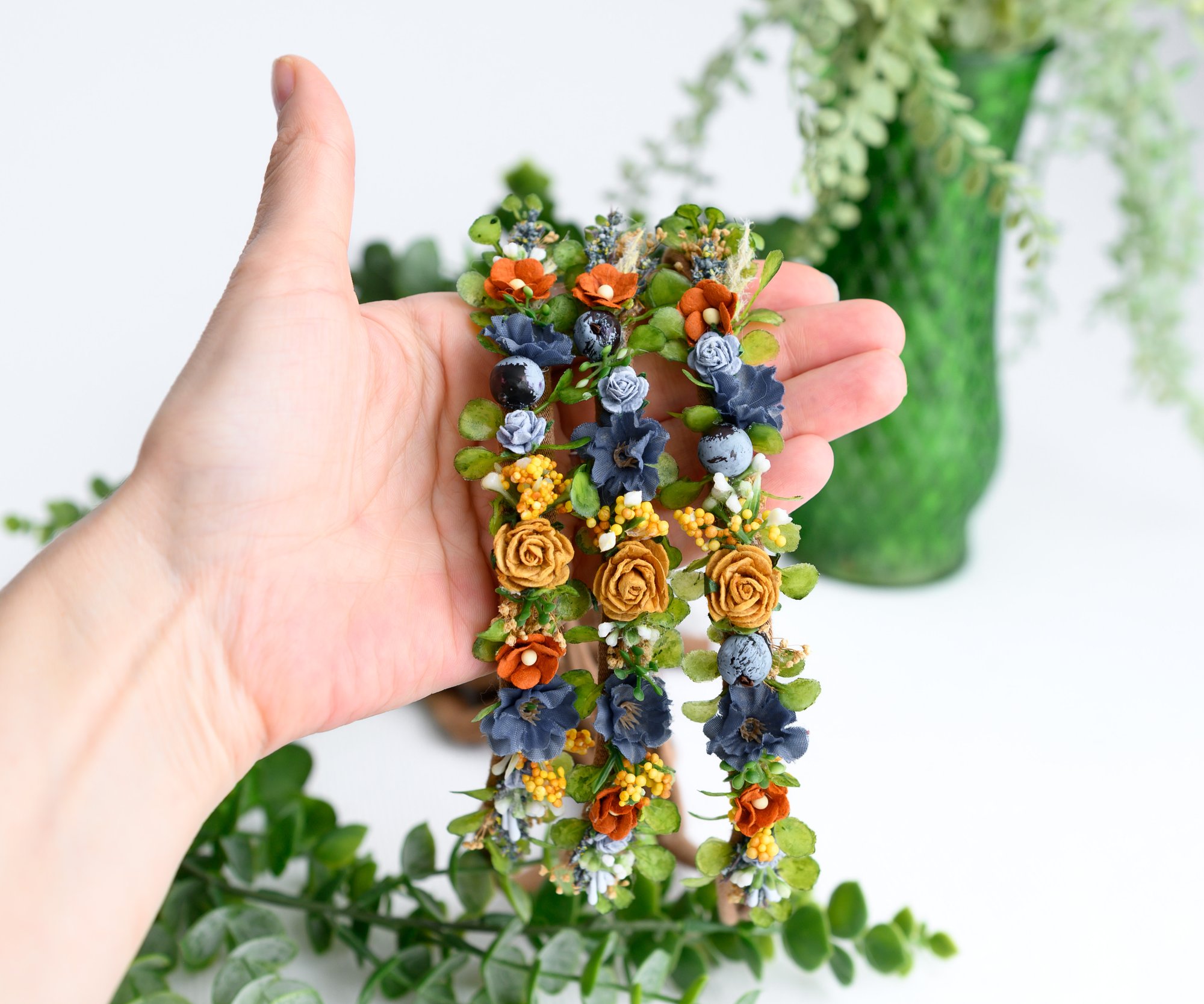 This headband blends deep navy florals with mustard gold roses, burnt orange accents, and tiny woodland berries — the perfect palette for autumn sessions.