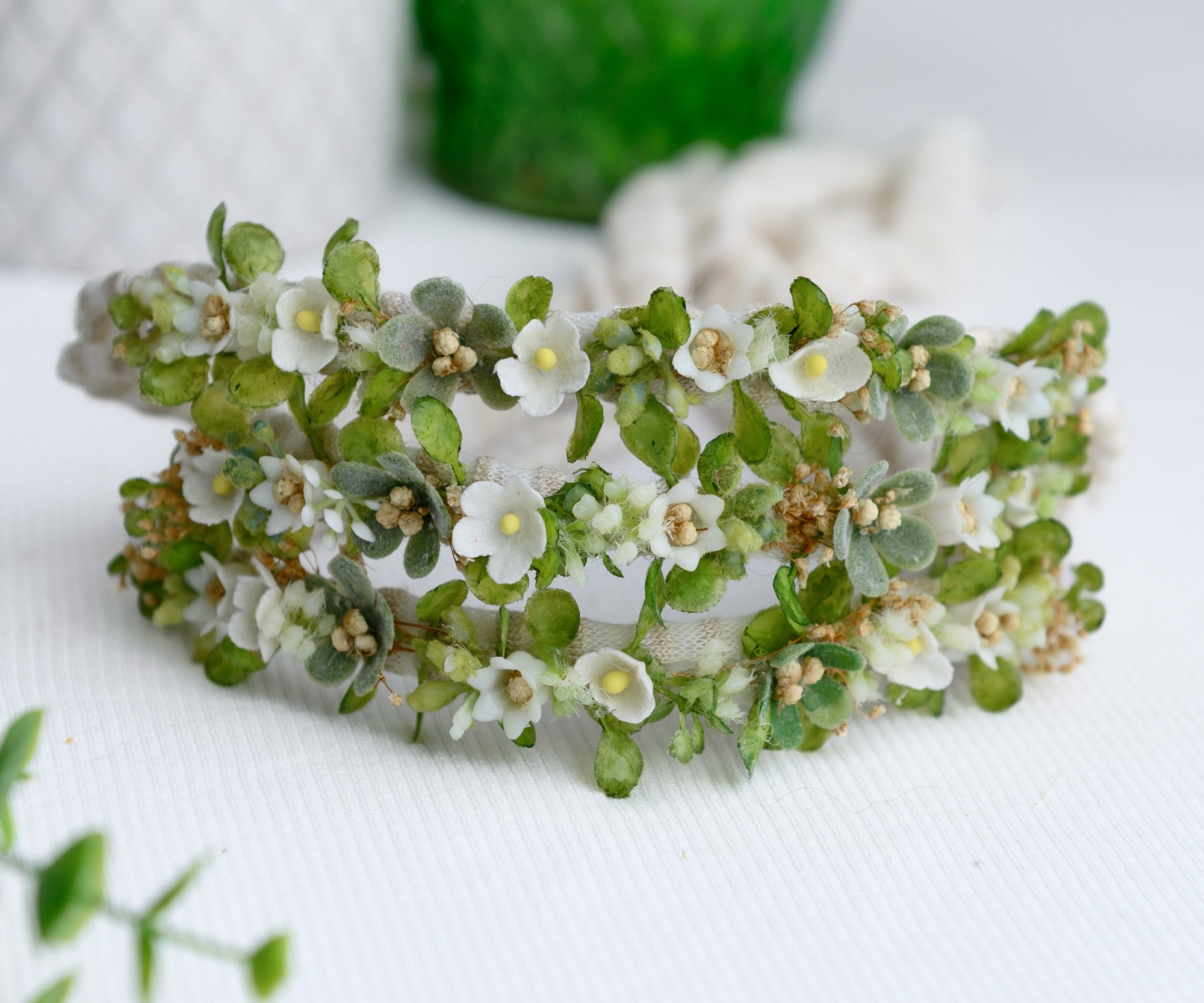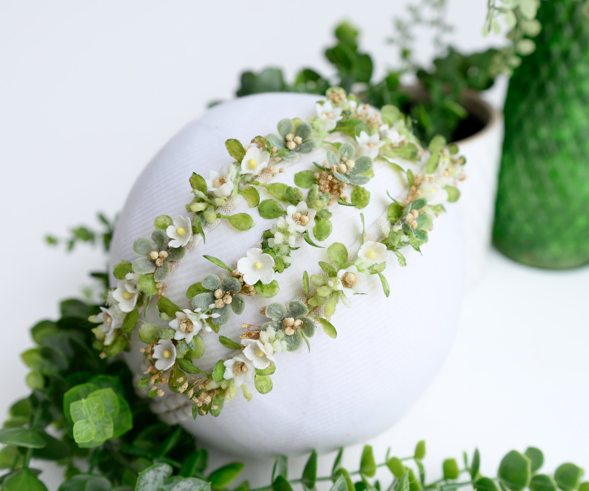 Inspired by garden greens and desert succulents, the Sage Succulent tieback blends soft sage leaves, tiny white florals, and earthy textures. A versatile piece that feels just as at home in spring as it does in cozy fall setups.
