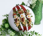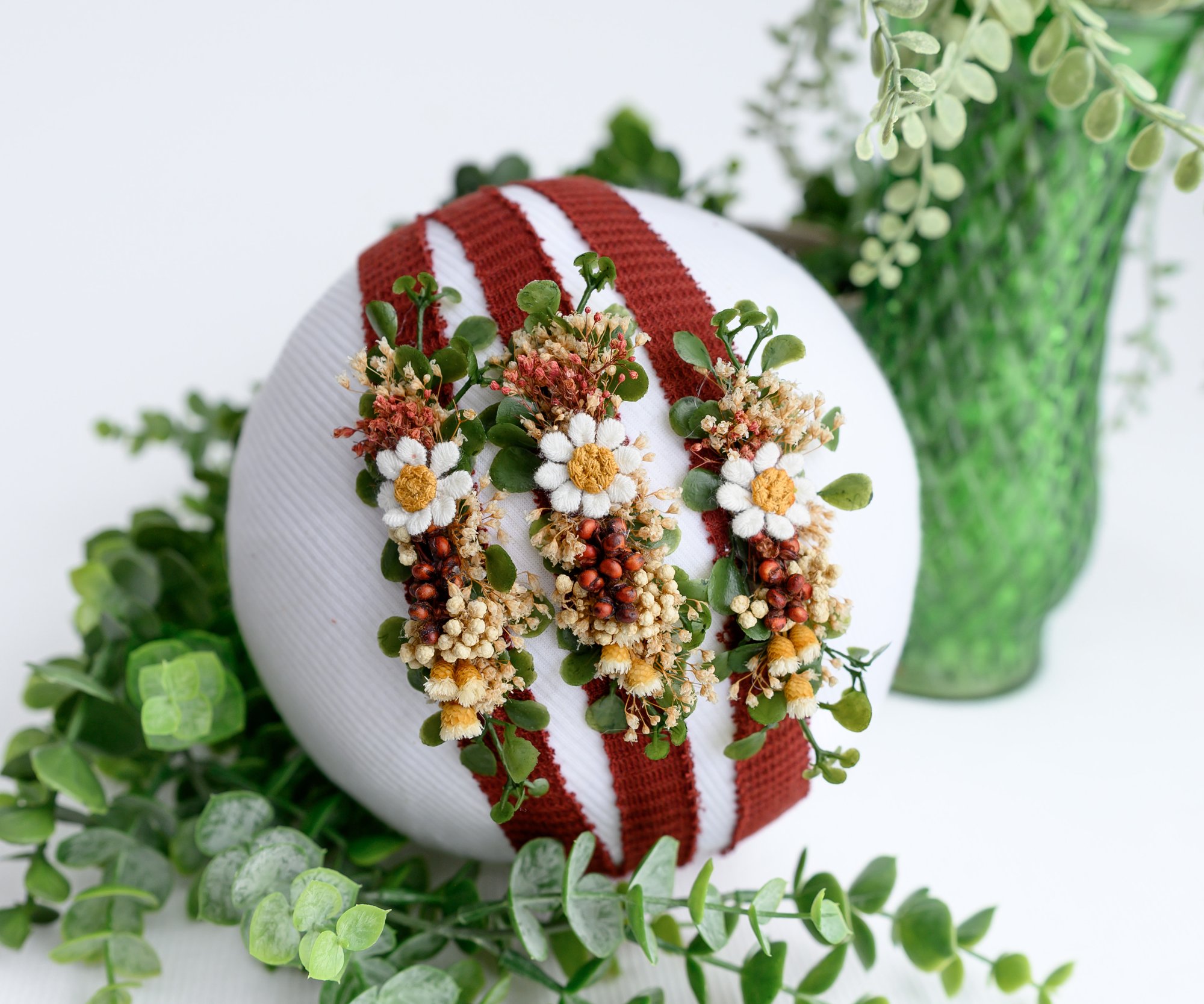 Rich rust tones meet cheerful white daisies in this autumn-inspired headband, accented with red berries, golden buds, and greenery for the perfect fall session piece.
