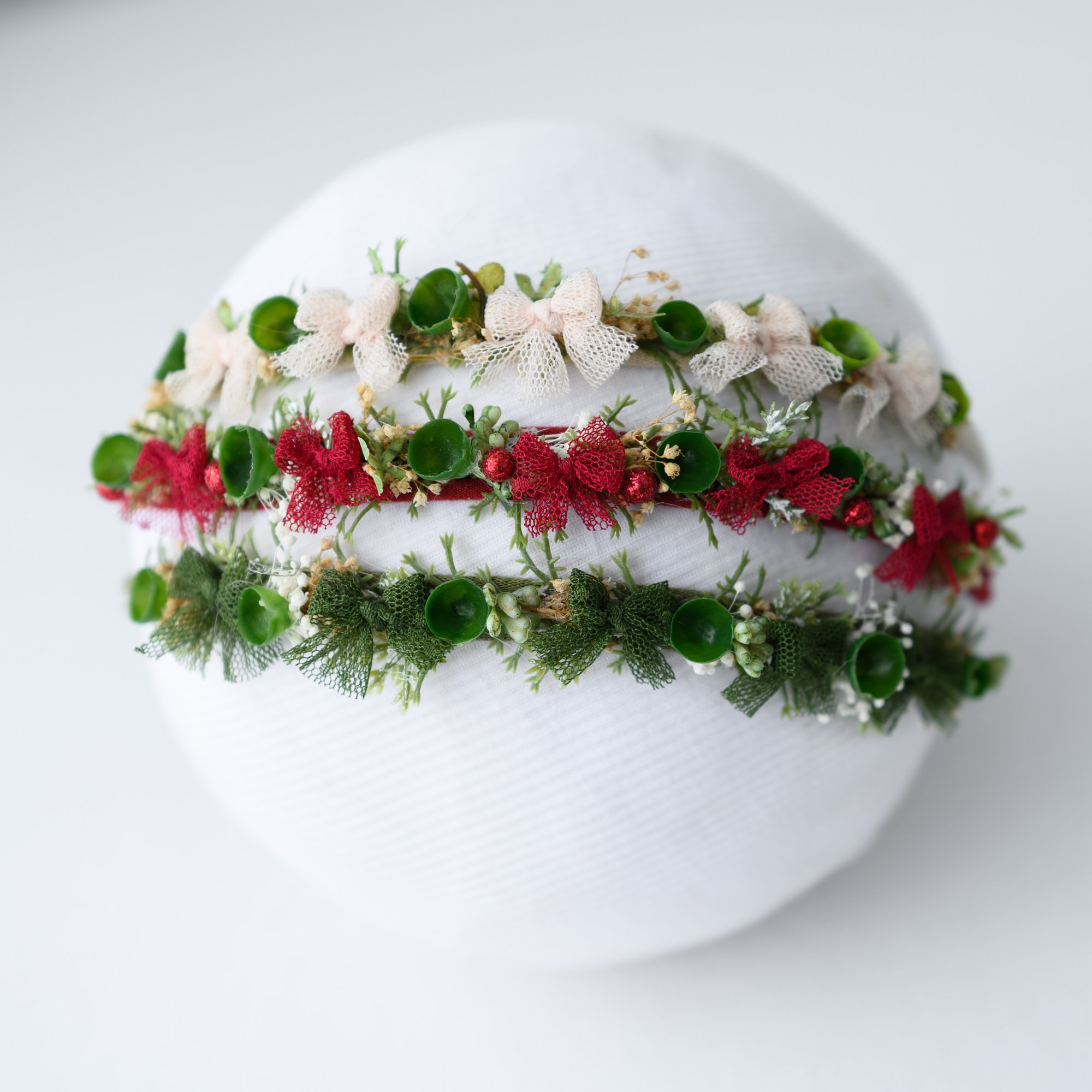 Meet Merry and Bright, a festive trio of handcrafted bowette headbands designed to bring soft holiday magic to your newborn sessions. Created with Bloomette’s signature attention to tiny details, each headband features miniature lace bows paired with delicate greenery, and baby's breath—giving you the perfect blend of Christmas charm and timeless sweetness.